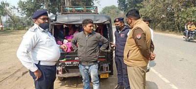 बहराइच : आज दिनाँक- 14.02.2022 को वरिष्ठ पुलिस अधीक्षक बहराइच केशव कुमार चौधरी के आदेशानुसार यातायात प्रभारी आनेंद्र यादव , उपनिरीक्षक यातायात शशी कांत कौल , आरक्षी दिनेश चौहान , आरक्षी सैय्यद इरफान अहमद के वाहन चेकिंग अभियान के अंतर्गत शहर क्षेत्र के विभिन्न चौराहों – तिराहों 30 वाहनों से रू0 43000 /- का आनलाइन चालान किया गया तथा लोगों को लाउड हेलर के माध्यम से जागरूक किया गया कि दो पहिया वाहन चलाते समय सदैव हेलमेट व चार पहिया वाहन चलाते समय सीट बेल्ट का प्रयोग करें व दो पहिया वाहन पर तीन सवारी न चलें तथा सभी वाहन चालकों को सूर्यास्त होने के बाद सदैव हेड लाइट प्रयोग करने हेतु जागरूक किया गया l