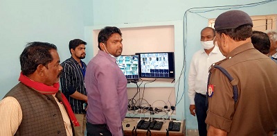 सीसीटीवी कैमरे के जरिए ईवीएम की निगरानी करते पुलिस कर्मी व राजनीतिक दलों के लोग।