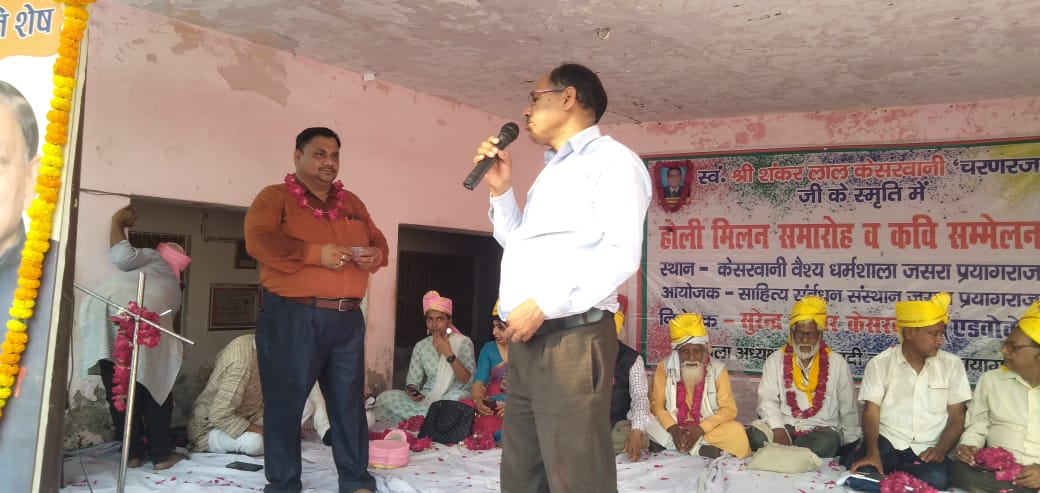 श्री बंसी लाल केसरवानी पूर्व प्रधानाचार्य जी को सम्मानित किया गया इस कार्यक्रम के आयोजक:- सुरेंद्र कुमार केसरवानी सहसंयोजक:- साहित्य संस्थान साहित्य संवर्धन संस्थान ने किया।। आए हुए सभी अतिथियों का सुरेंद्र कुमार केसरवानी ने आभार व्यक्त किया। और कवियों ने अपनी कविता के माध्यम से क्षेत्र से आए सैकड़ों गणमान्य व्यक्तियों का मन मोह लिया इस दौरान कवियों ने एक से बढ़कर एक कविताएं सुना कर अतिथियों का उत्साहवर्धन किया हास्य कवि बिहारी लाल अंबर,वंदना पाठक,शायर मुराद अहमद मुराद, क्राइम इनफार्मेशन ब्यूरो ऑफ इंडिया के मंडल अध्यक्ष प्रयागराज परवेज आलम, छविनाथ पाठक, इफ्तिखार अहमद,राशिद हयात, श्यामा कांत मिश्रा जैसे समाजसेवी मौजूद रहे इस दौरान होली मिलन का कार्यक्रम चलता रहा होली मिलन व कवि सम्मेलन करा करके सुरेंद्र केसरवानी ने अतिथियों वा समाजसेवियों का दिल जीत लिया।