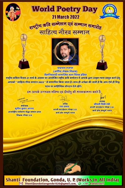 सुल्तानपुर : विश्व कविता दिवस के शुभ अवसर पर राष्ट्रीय कवि सम्मेलन एवं सम्मान समारोह में आर्टिस्ट चंद्रपाल राजभर को साहित्य गौरव सम्मान 2022 से नवाजा गया इस राष्ट्रीय कवि सम्मेलन में संपूर्ण भारत से उत्कृष्ट कवियों एवं साहित्यकारों ने प्रतिभाग किया था जिसमें जनपद सुल्तानपुर के चंद्रपाल राजभर (आर्टिस्ट) ने भी अपनी रचना “कदम-कदम दर चलना भैया ‘लोक जन से कहना भैया’ मेरा वतन है मेरी शान’ मेरा यह देश मेरी जान भैया” नामक रचना के साथ प्रतिभाग कर लोगों का मन मोह लिया आपको बताते हुए अपार खुशी हो रही है कि चंद्रपाल राजभर इस समय सामाजिक पहलुओं एवं पक्षी संरक्षण पर भी कविताएं लिखकर पढ़कर देश-दुनिया के साथ जनमानस की जागृति चेतना बढ़ाने का कार्य कर रहे हैं जिसको देखते हुए शांति फाउंडेशन गोंडा की जजमेंट कमेटी ने चंद्रपाल राजभर को साहित्य गौरव सम्मान 2022 से सम्मानित किया इस कार्यक्रम के संयोजक सुनील कुमार आनंद जी रहे यह कार्यक्रम ऑनलाइन गूगल मीट के माध्यम से संपन्न हुआ तथा वहीं इस सम्मान की खुशी आर्टिस्ट चंद्रपाल राजभर के प्रशंसकों के साथ संपूर्ण भारत वासियों को भी है
