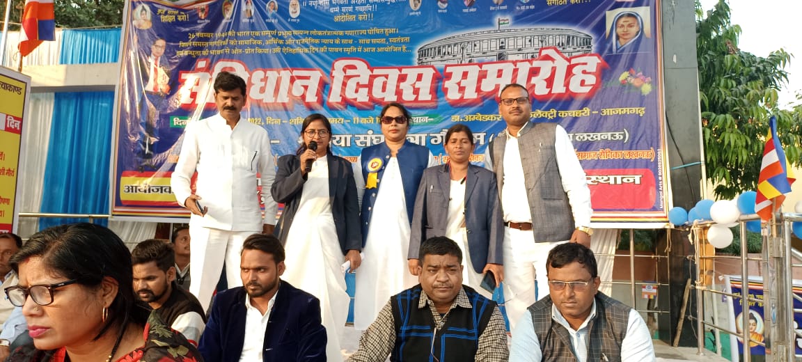 आजमगढ़। माता सावित्री बाई फूले शिक्षण एवं प्रशिक्षण संस्थान के तत्वावधान में संविधान दिवस शनिवार को नगर के अम्बेडकर पार्क में मनाया गया। कार्यक्रम की शुरूआत मुख्य अतिथि संघमित्रा गौतम, पूर्व सांसद डा बलिराम, डा राकेश कुमार बौद्ध आदि द्वारा डा भीमराव अम्बेडकर के आदम कद प्रतिमा पर माल्यार्पण करते हुए उन्हें नमन किया गया। इसके बाद वन्दना बौद्ध के नेतृत्व में पंच शील के साड़ी में तथागत बुद्ध की वन्दना स्तुति की गई। संचालन बिन्दु गौतम ने किया।