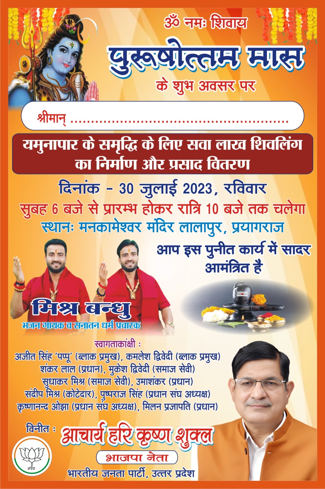 प्रयागराज :- गौहनिया लालापुर पाषाण कालीन सभ्यता के चिन्हों से समृद्ध गुफाओं में सिद्ध ऋषियो की तपस्थली के साक्ष्य समतल जमीनों के बीच शिवलिंग स्वरूप मनकामेश्वर पर्वत एवं शिव पुराण एवं मत्स्य पुराण में वर्णित शिवलिंग है ये सब यमुना किनारे स्थित बारा तहसील के अंतर्गत लालापुर में स्थित है अत्यन्त मनोरम स्थल जो नागा सन्यासियो द्वारा पूजित रहा है। प्रयाग से 35 km की दूरी पर मसुरिया देवी मन्दिर इमिलिया से 4 किलोमीटर दूर स्थित है इसका जीर्णोद्धार 1997 में स्थानीय भाजपा नेता आचार्य हरि कृष्ण शुक्ल ने करवाया था। वही पर यमुनापर की सांस्कृतिक विरासत को बढ़ाने के उद्देश्य से पुरुषोत्तम मास के त्रयोदशी को दिनांक 30/7/2023 को सवा लक्ष पार्थिव शिवलिंक का निर्माण और जल अभिषेक एवं 25000 श्रद्धालुओं को भण्डारा प्रसाद का आयोजन किया जा रहा है समस्त यमुनापार वासियो एवं प्रयागवासियों को भी आमंत्रित किया जा रहा है। सभी इस आध्यात्मिक भगवान शिव की उपासना में पहुंचकर भगवान शिव की कृपा प्राप्त करें यह शिव का यज्ञ होनी को रोकने की भी शक्ति रखता है यह मैंने अपने ज्योतिषीय एवं आध्यात्मिक जीवन में एवं समाजसेवा के दौरान देखा है आचार्य हरि कृष्ण शुक्ल भाजपा नेता ने बताया और मनकामेश्वर मंदिर पर प्रयागराज के मशहूर सूफी भजन गायक मिश्रा बंधुओं का प्रोग्राम भी होगा।
