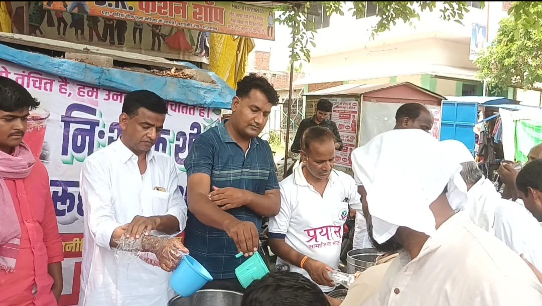 आज़मगढ़ :- उमस भरी गर्मी से परेशान हो रहे राहगीरों को सामाजिक संगठन प्रयास द्वारा रूह अफ़ज़ा एवं एनर्जी ड्रिंक की व्यवस्था बाजार के सम्मानित डॉक्टर इमरान अहमद एवं ग्राम प्रधान अबू बकर के सहयोग से किया गया शरबत स्टॉल लगाकर फ़रिहा बाजार में सैकड़ो यात्रियों एवं राहगीरों को रूह अफजा शरबत पिलाया गया