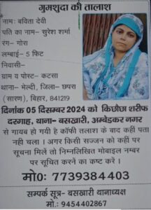 मिली जानकारी के अनुसार, महिला का नाम बबीता देवी है, जो बिहार के छपरा जिले के कटसा गांव की निवासी हैं। बबीता देवी करीब एक साल पहले अपने परिवार के साथ अंबेडकर नगर जिले के किछौछा स्थित दरगाह शरीफ में अपनी सलामती की दुआ करने आई थीं। एक लॉज में ठहरकर वह अपनी पूजा कर रही थीं, लेकिन अचानक वह गायब हो गईं। बबीता के परिवार ने काफी समय तक उनकी तलाश की, लेकिन कोई सुराग नहीं मिला। तब परिवार ने बसखारी थाने में गुमशुदगी की रिपोर्ट दर्ज कराई थी।