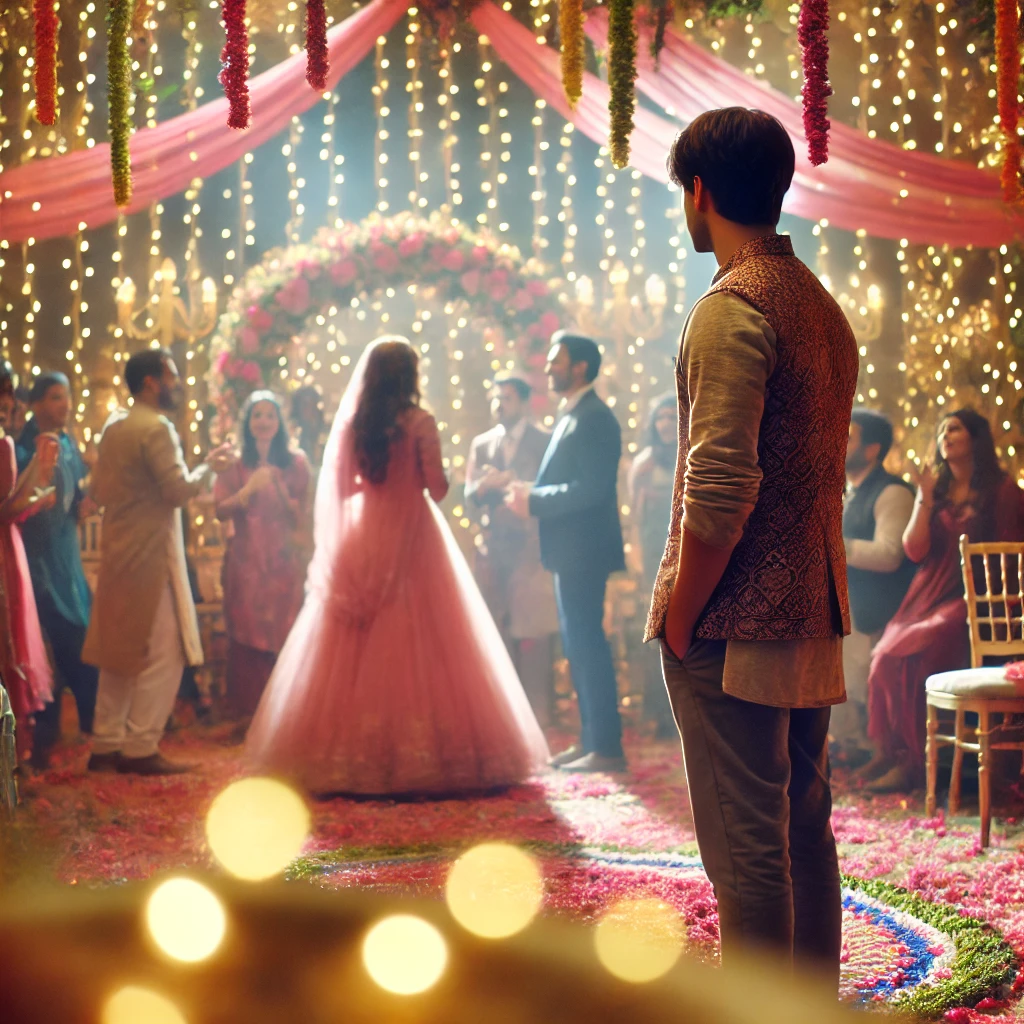 प्रेमी अपनी प्रेमिका की शादी में शामिल हो रहा है, लेकिन उसके मन में एक हल्की सी नाराज़गी और उदासी है। वह ज़ाहिर तो नहीं करता, मगर उसका दिल इस सच्चाई को स्वीकार नहीं कर पा रहा। उसके होंठ मुस्कान का दिखावा कर रहे हैं, मगर आँखों में अभी भी आंसू भरे हैं।