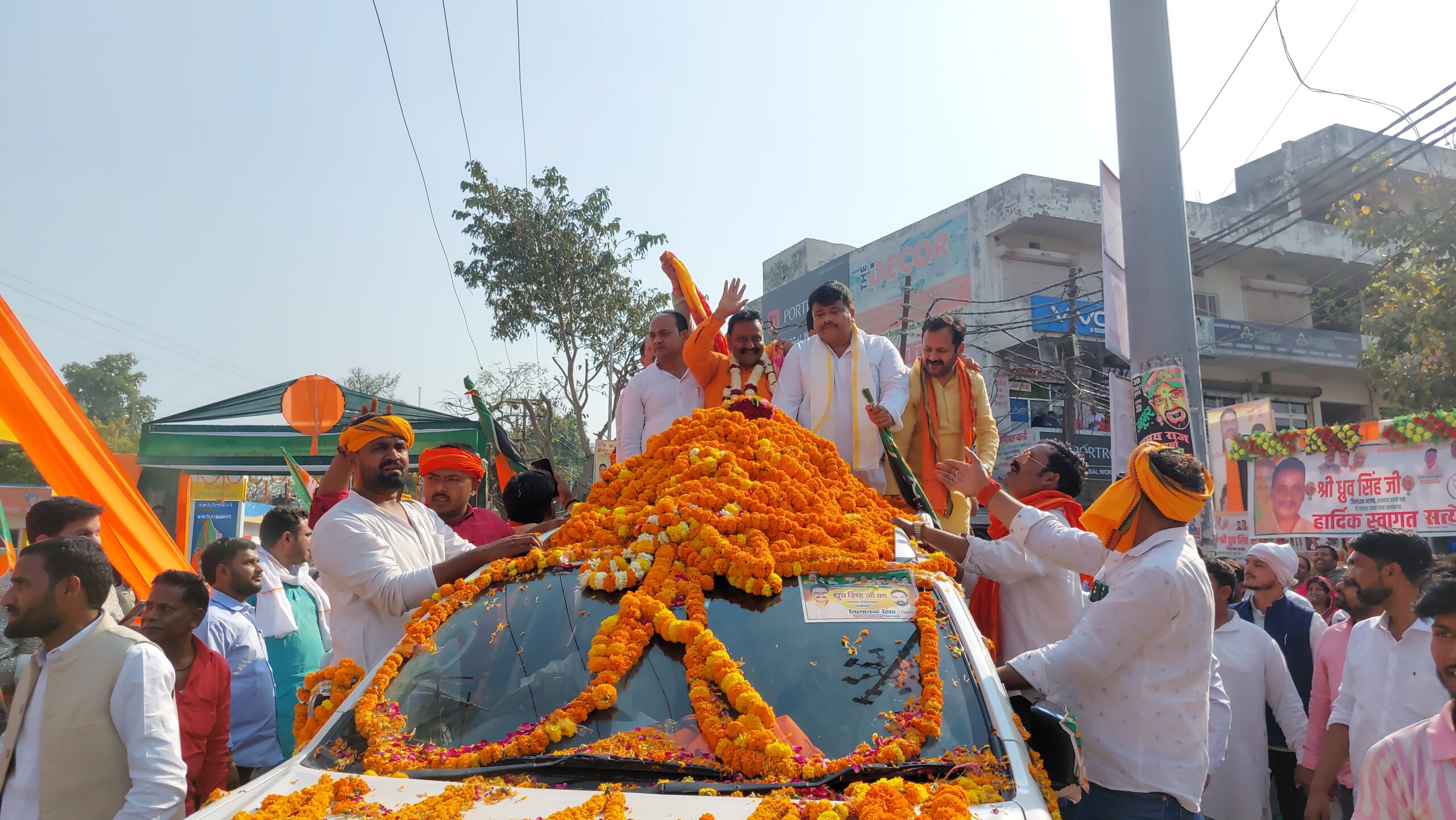 ध्रुव कुमार सिंह जब अपने घर से जिले के लिए रवाना हुए, तब जगह-जगह कार्यकर्ताओं ने उनका भव्य स्वागत किया। शहर के घंटाघर क्षेत्र में गोपालपुर विधानसभा के पूर्व प्रत्याशी सत्येंद्र राय ने विशेष स्वागत द्वार बनवाया था। जैसे ही जिलाध्यक्ष वहां पहुंचे, कार्यकर्ताओं और सत्येंद्र राय ने जोरदार स्वागत किया।